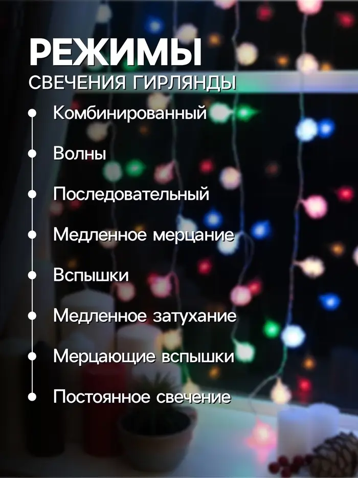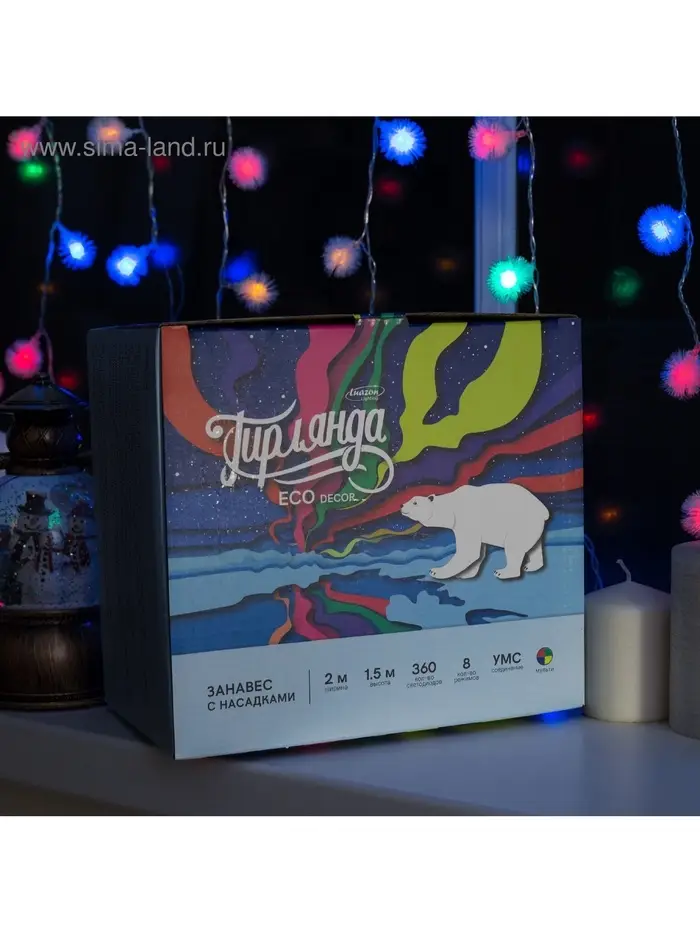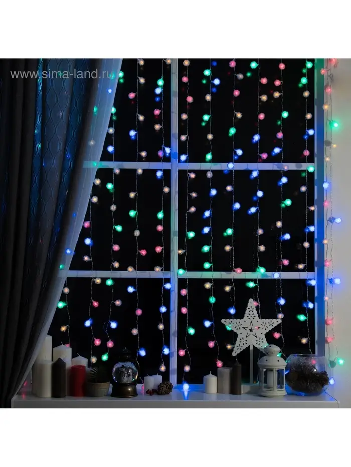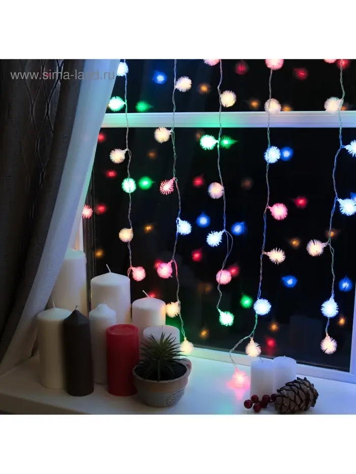 Гирлянда «Занавес» 2×1.5 м с насадками «Ёжики», IP20, прозрачная нить, 360 LED, свечение мульти, 8 режимов, 220 В