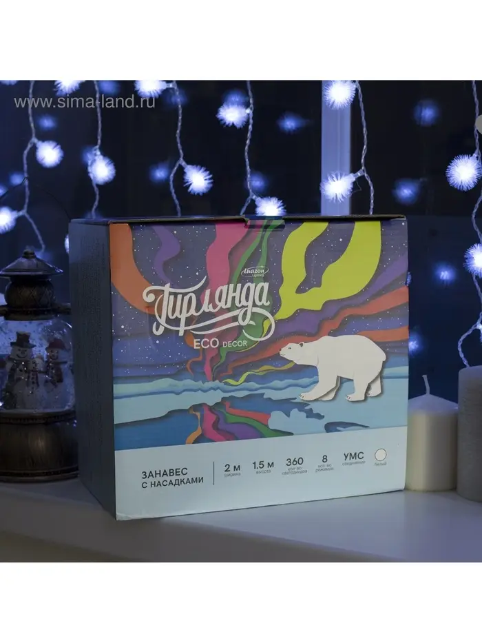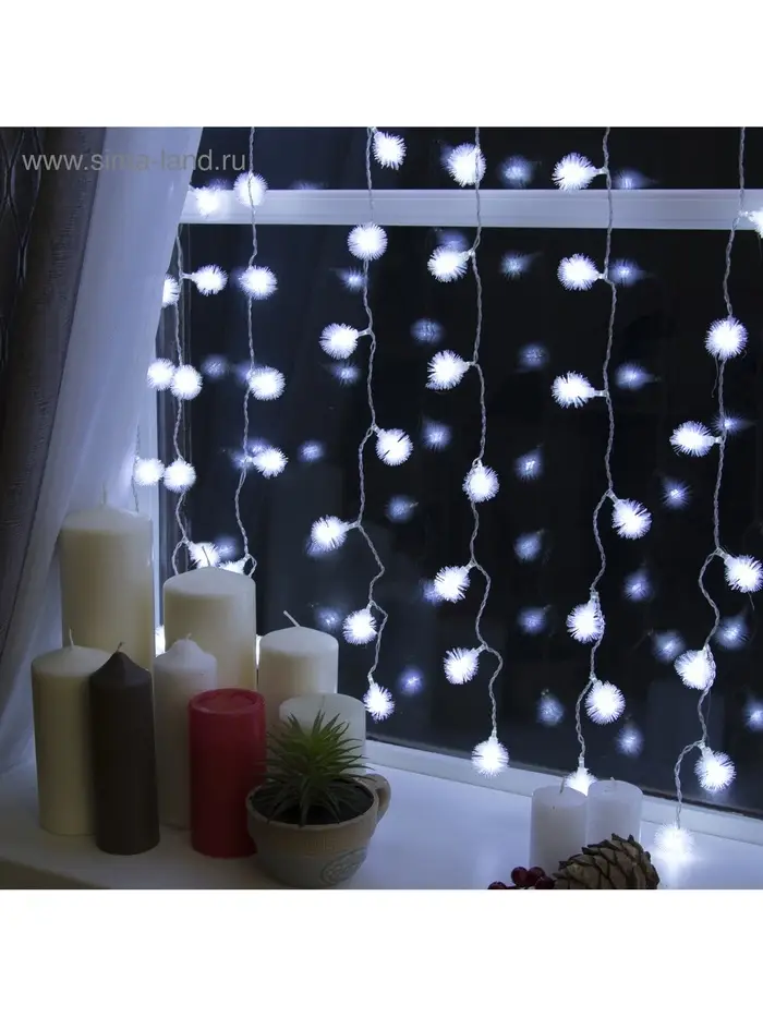 Гирлянда «Занавес» 2×1.5 м с насадками «Ёжики», IP20, прозрачная нить, 360 LED, свечение белое, 8 режимов, 220 В