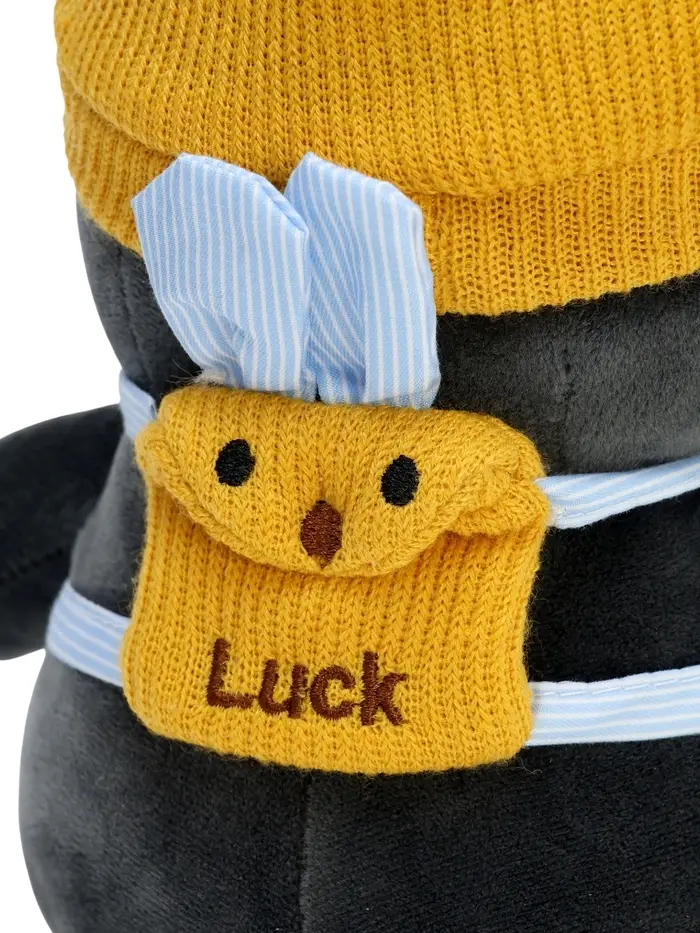 - Жёлтая шапка придаёт игрушке игривый и запоминающийся внешний вид.