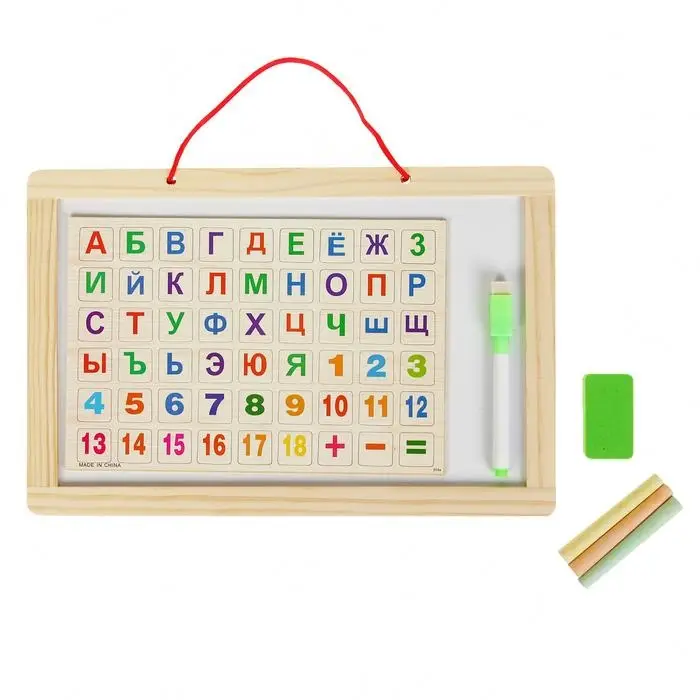 Доска двусторонняя, малая, в наборе магниты с алфавитом, маркер на водной основе, мелки, губка
