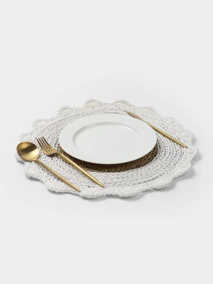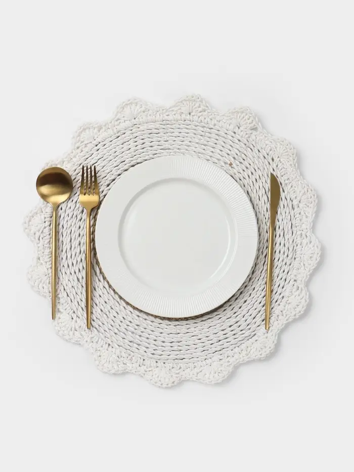 - Фактурная плетёная поверхность: Салфетка обладает объёмной текстурой, которая визуально оживляет стол. Она создаёт красивый контраст с гладкой поверхностью тарелок и стеклянной посуды, делая сервировку более интересной и профессиональной.