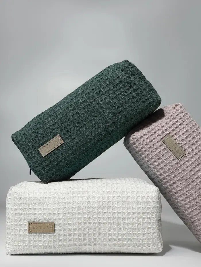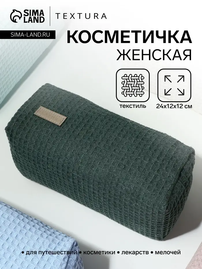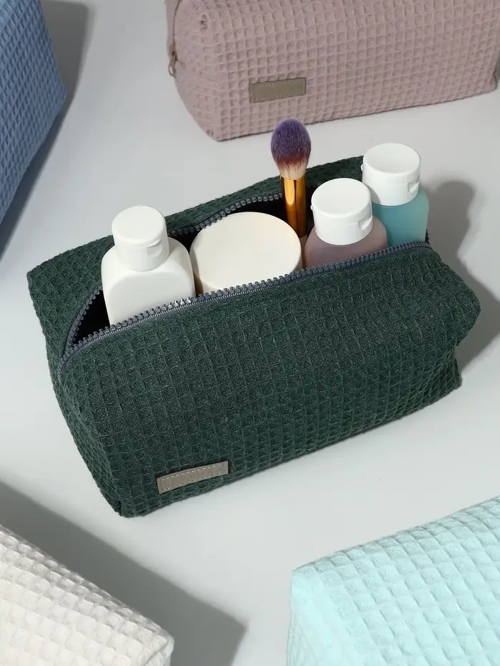 Просторная косметичка в зелёном цвете с характерной вафельной текстурой — удобное решение для хранения косметических принадлежностей. Мягкий текстиль с рельефной поверхностью сохраняет форму, а надёжная молния обеспечивает защиту содержимого.