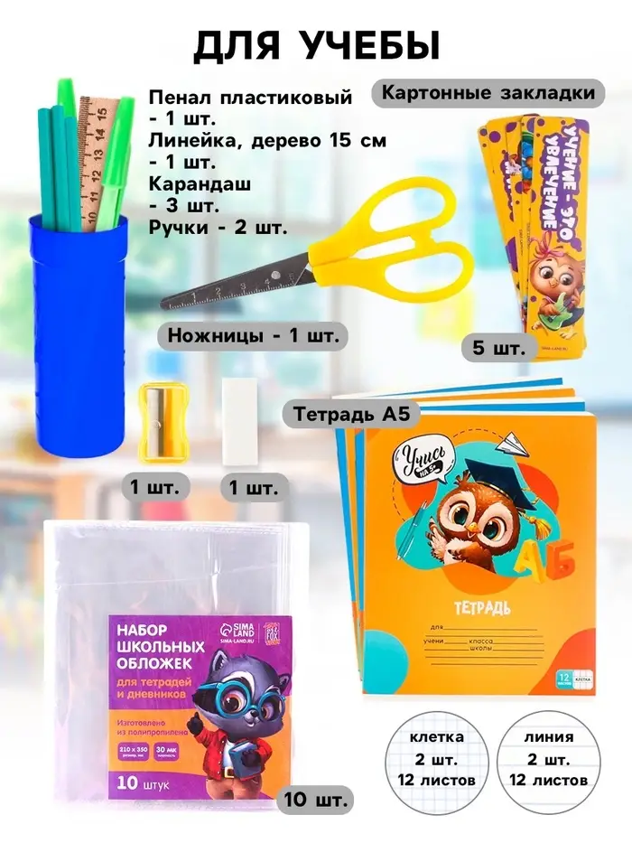 Закладка, Карандаши, Кисть, Краски, Ластик, Линейка, Ножницы, Обложка для тетради, Пенал, Ручка, Тетрадь, Точилка