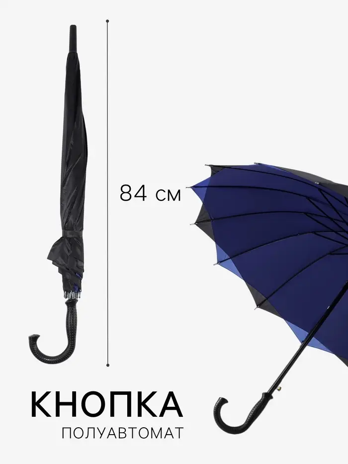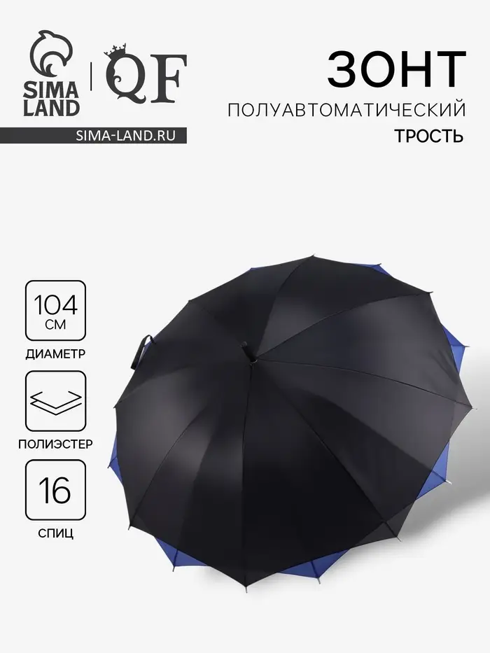 Зонт - трость полуавтоматический «Однотонный», двухслойный, 16 спиц, R=52/60 см, d=104 см, чёрный, синий
