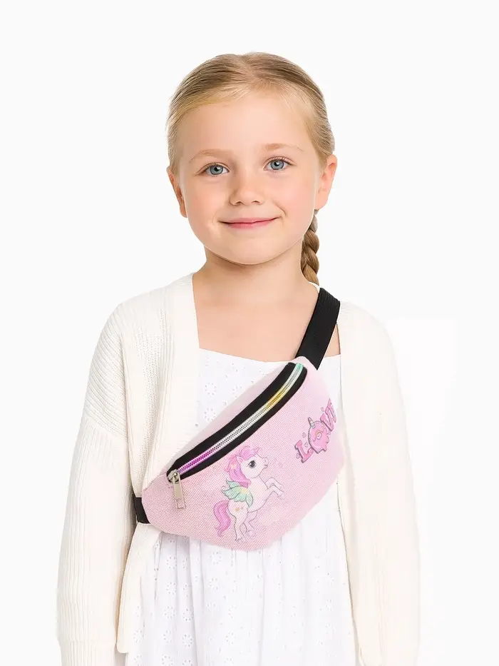 Чудесный аксессуар для каждой маленькой модницы — розовая поясная сумочка с волшебным изображением единорога. Этот стильный аксессуар привнесёт яркое настроение в каждый день юной дамы, добавляя игривости и фантазии в повседневную жизнь.