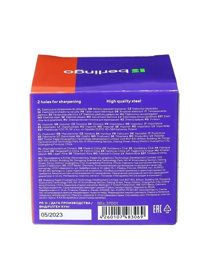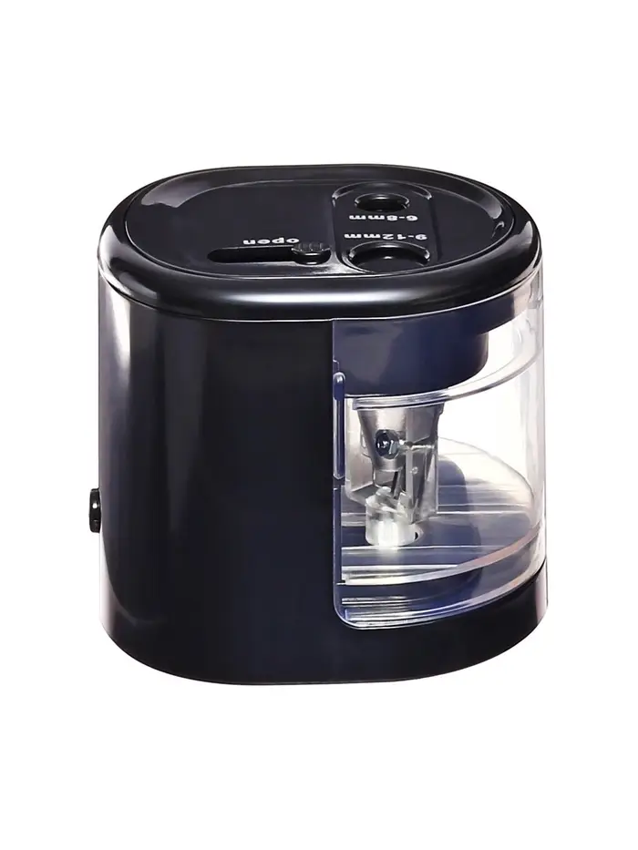 Настольная точилка для чернографитовых и цветных карандашей. Прочный пластиковый корпус. Съёмный контейнер для стружки. Работает на 4 батарейках AA (поставляется без батареек). Может использоваться для ручной заточки.