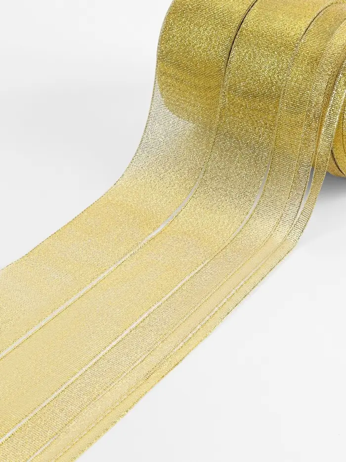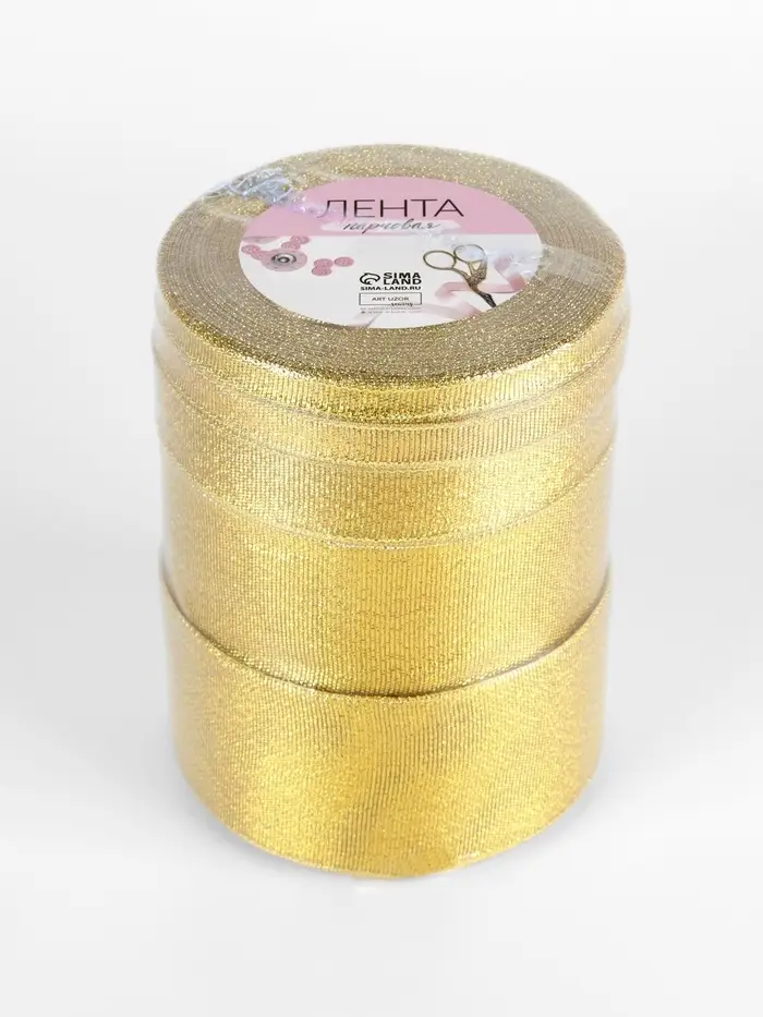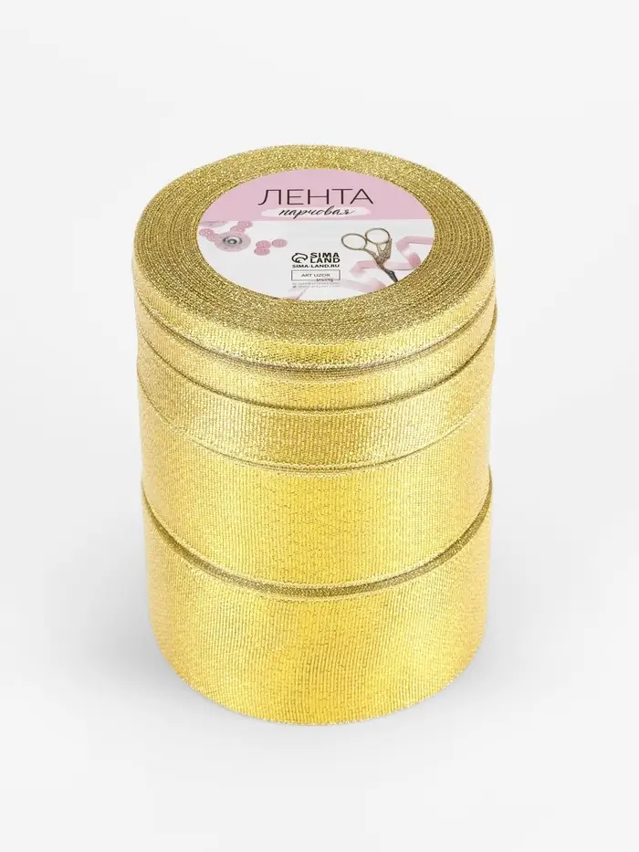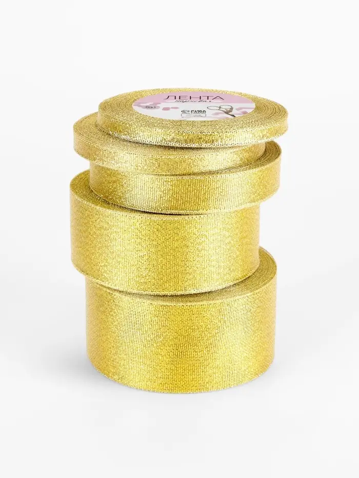 Набор золотых парчовых лент включает пять размеров для разных декоративных задач. Каждая 23-метровая лента в рулоне подходит как для тонкой отделки, так и для создания крупных праздничных элементов.