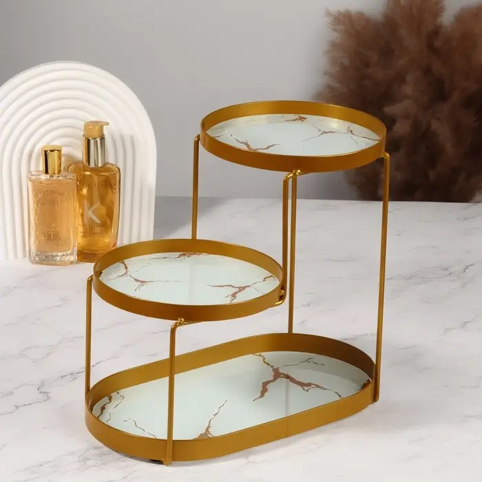 Созданный из качественного металла и стекла, органайзер привносит нотку роскоши в любой интерьер, будь то спальня, ванная комната или гостиная. Три открытые секции разной высоты обеспечивают удобное хранение и быстрый доступ к вашим предметам, будь то парфюмерия, кремы, флаконы или другие мелочи. Компактные размеры (30 x 17 x 26,5 см) позволяют разместить его на полке, столе или в шкафу, не занимая много места.