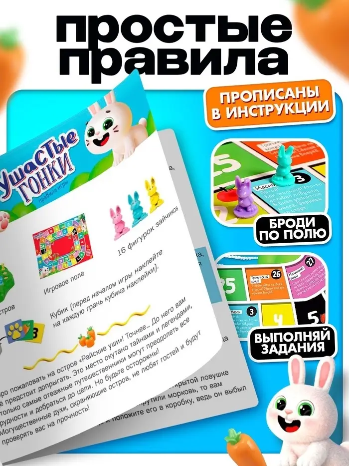 «Ушастые гонки. Загадка острова» — настольная игра для детей от 4 лет. Озорные зайчишки отправляются в увлекательное путешествие на таинственный остров «Райские уши» в поисках Священной морковки. На пути пушистых любителей приключений ожидают преграды и опасности! Ребёнку предстоит преодолеть препятствия и помочь зайчикам добраться до цели.