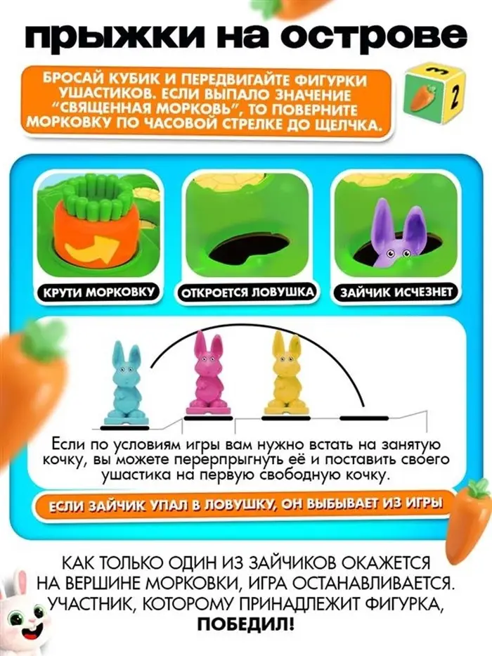 - Как только один из зайчиков окажется на вершине морковки, игра останавливается. Участник, которому принадлежит эта фигурка, победил!