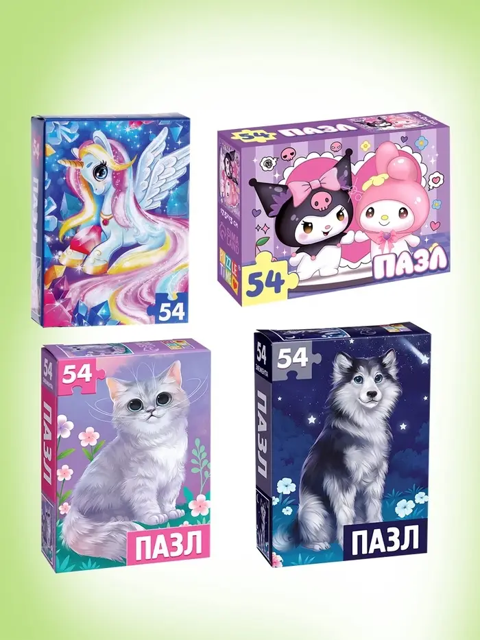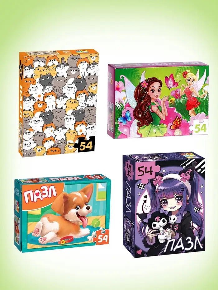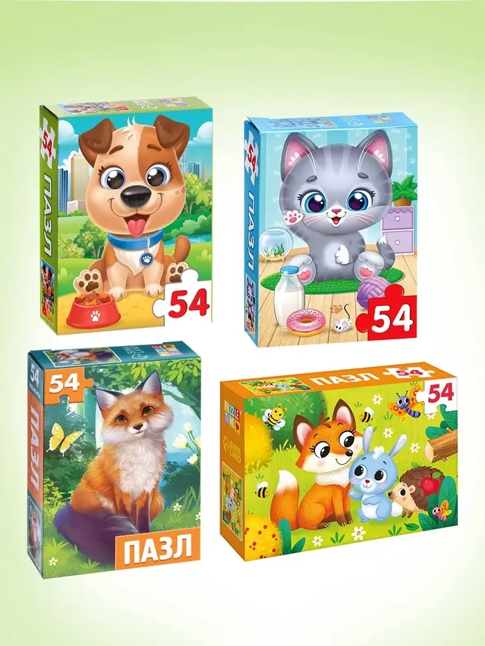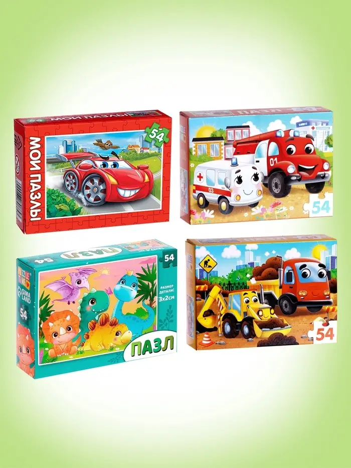 - Каждый пазл состоит из 54 деталей, что идеально подходит для детей от 3 лет.