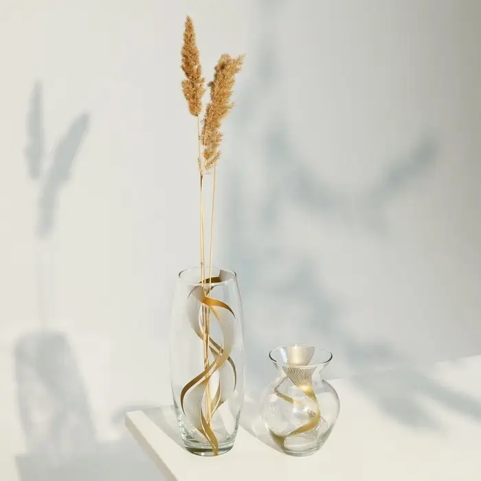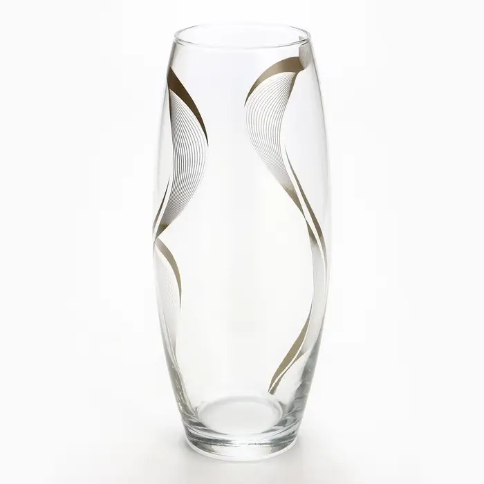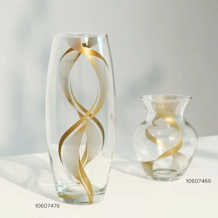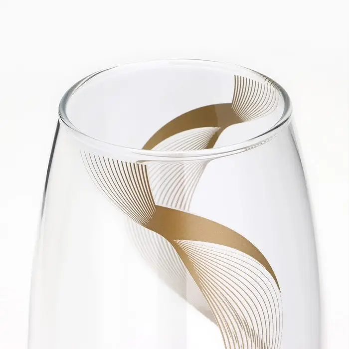 Она выполнена из прозрачного стекла и украшена золотистыми линиями, создающими стильный и современный образ.