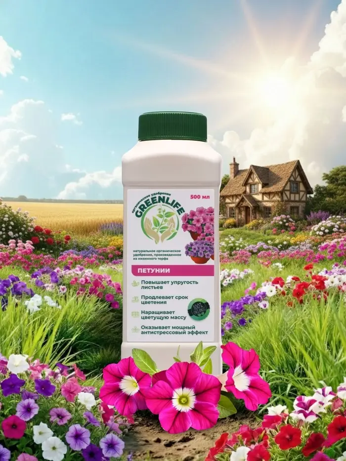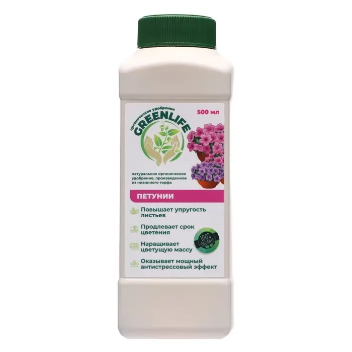 ""Органическое удобрение "Green Life" для петуний"", объемом 0,5 литра, представляет собой натуральное органическое удобрение, произведенное из низинного торфа.