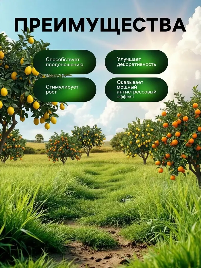 - Богатый набор питательных веществ. Удобрение содержит оптимальное сочетание макро- и микроэлементов, необходимых для здорового роста и развития цитрусовых растений.