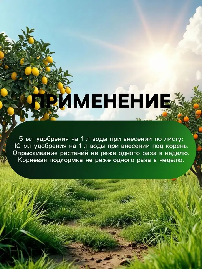 ""Способ применения"":Удобрение "Green Life" рекомендуется вносить в почву во время посадки цитрусовых растений или внесения подкормок в течение вегетационного периода. Для этого необходимо развести удобрение в соотношении 1:10 с водой и равномерно распределить по почве вокруг корневой зоны растений.
