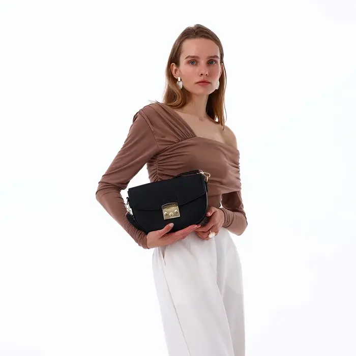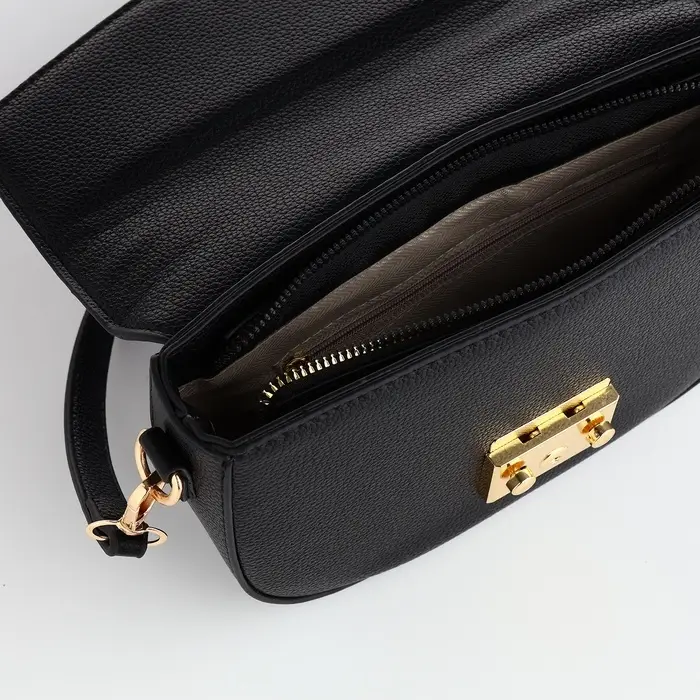 - Изысканный дизайн: сочетание чёрного цвета и золотистой фурнитуры делает сумку универсальной для любого образа.