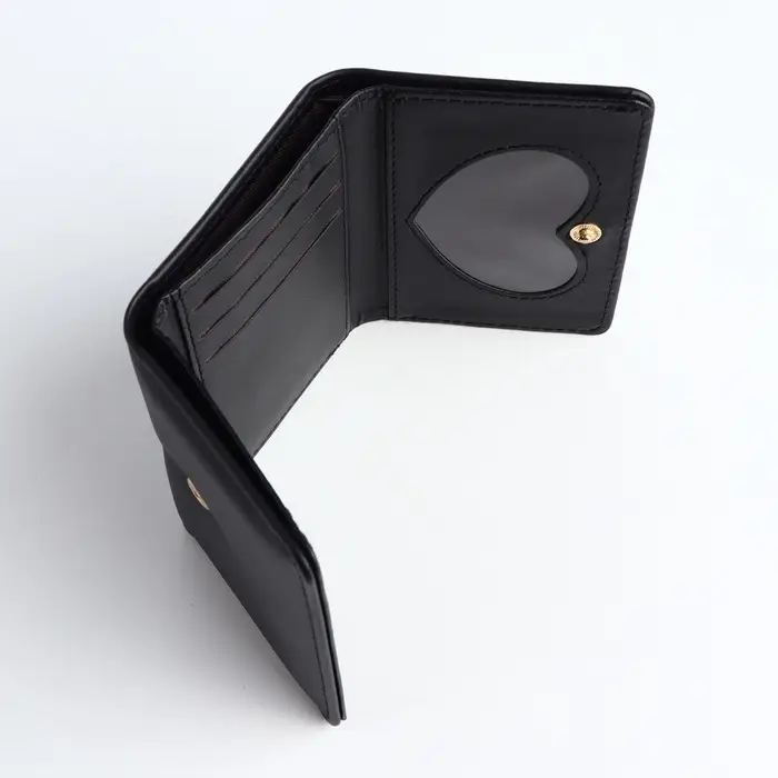 Маленький чёрный кошелёк на кнопке — стильный и практичный подарок для девочки к 8 Марта или на день рождения. Его компактный тройной формат легко помещается в карман или небольшую сумочку, сохраняя аккуратный вид. Искусственная кожа приятна на ощупь, а милый бант добавляет образу нежности.