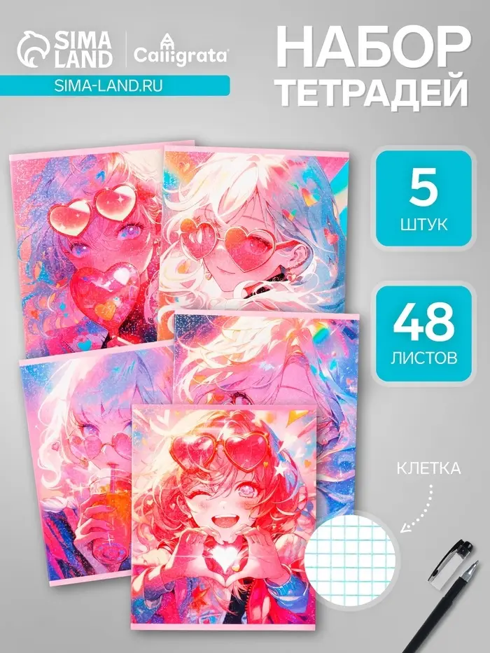 Набор тетрадей, 48 листов в клетку, Calligrata «В розовых очках», серые листы, 5 штук