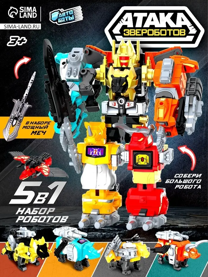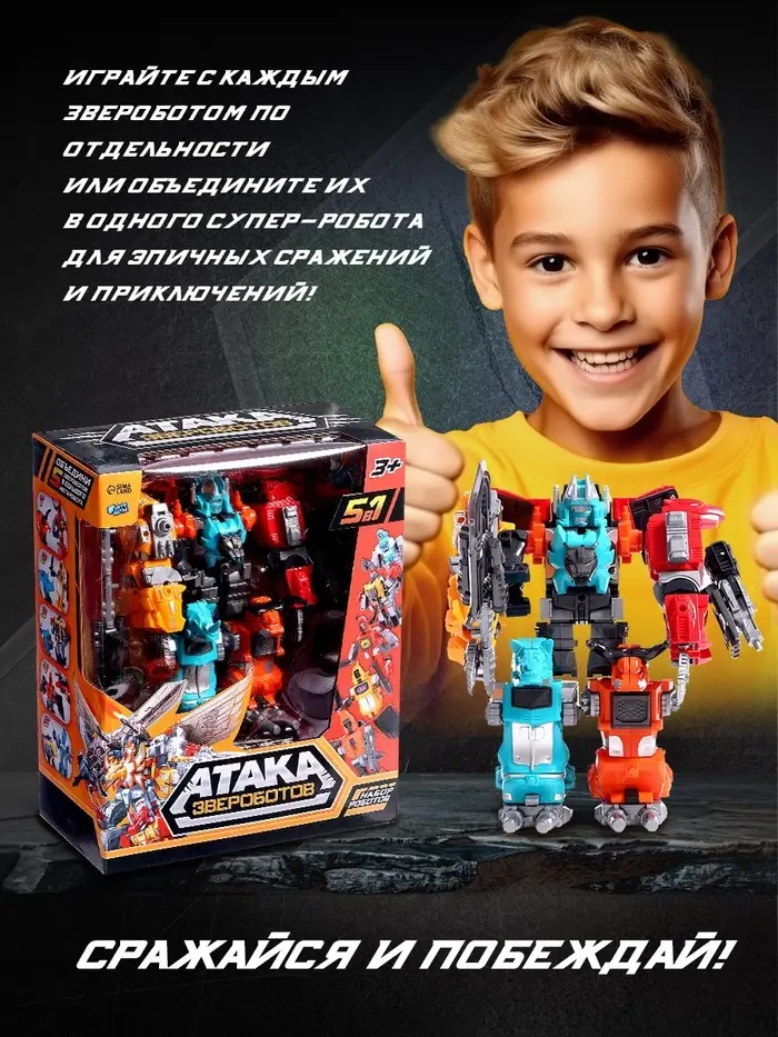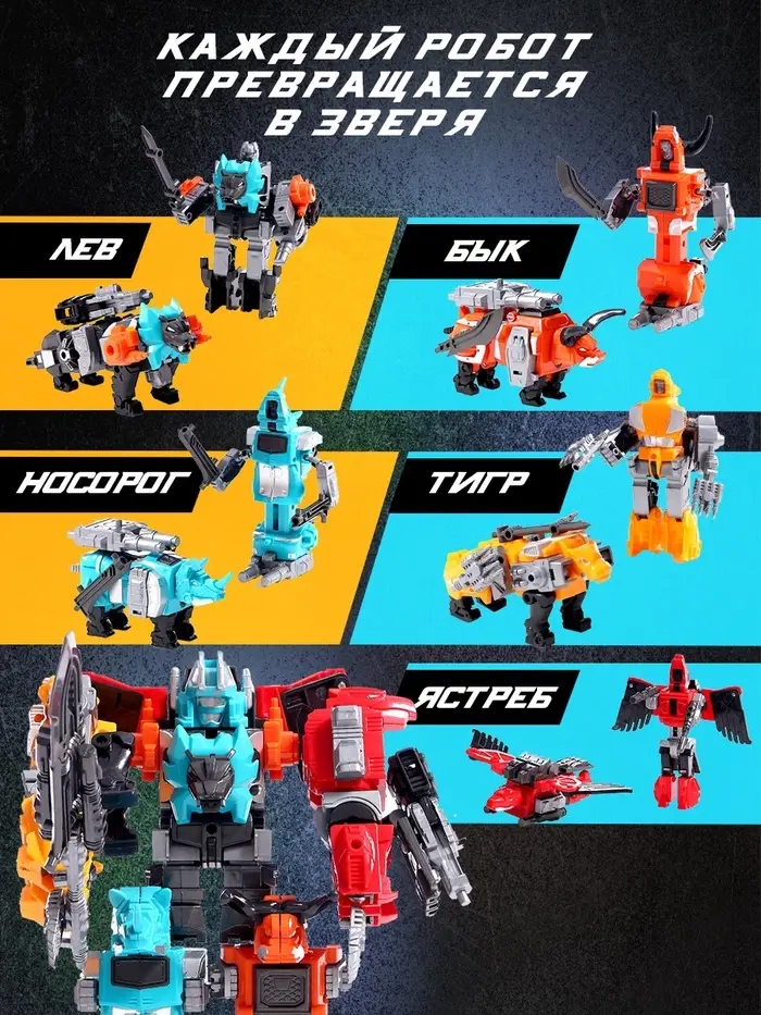 Собери силу в пятером и пусть начнётся битва! Набор трансформеров «Атака звероботов» — это 5 роботов-зверей, которые умеют превращаться и объединяться в одного гигантского героя. Идеально для тех, кто любит механические головоломки, динамичные сюжеты и мощь командного духа.