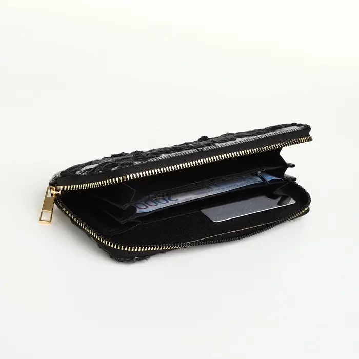 С этим клатчем вы добавляете в образ элемент современной практичности. Его сдержанный чёрный цвет и джинсовая фактура создают гармоничное сочетание с разными стилями — от casual до smart casual. Аксессуар становится не просто кошельком, а выразительной деталью вашего повседневного образа.