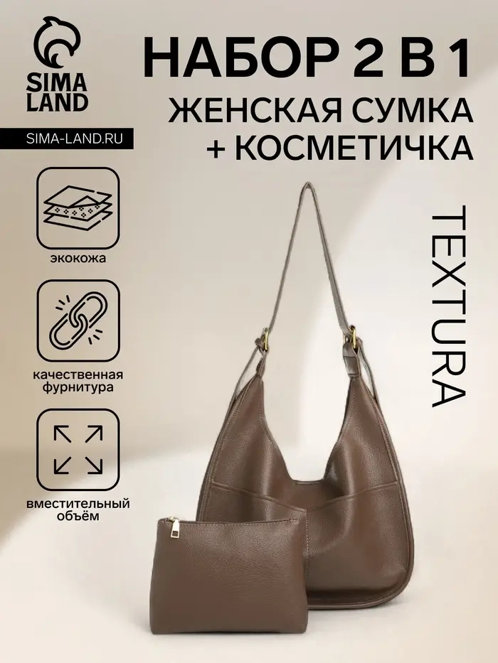 Сумка - мешок женская TEXTURA, на магните, с косметичкой, 34×12×27 см, коричневая