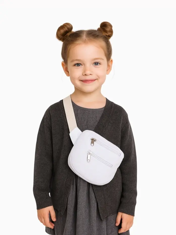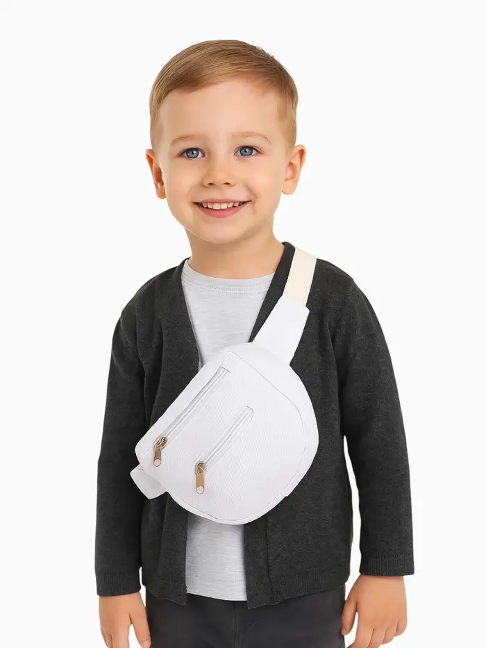 Эта белая поясная сумка — надёжный спутник для активного дня. Её компактный размер идеально подходит для ребёнка: в ней поместится всё необходимое, не сковывая движений. Мягкий текстиль приятен на ощупь, а регулируемый ремень легко настроить по фигуре для комфортной носки на бедре или через плечо.