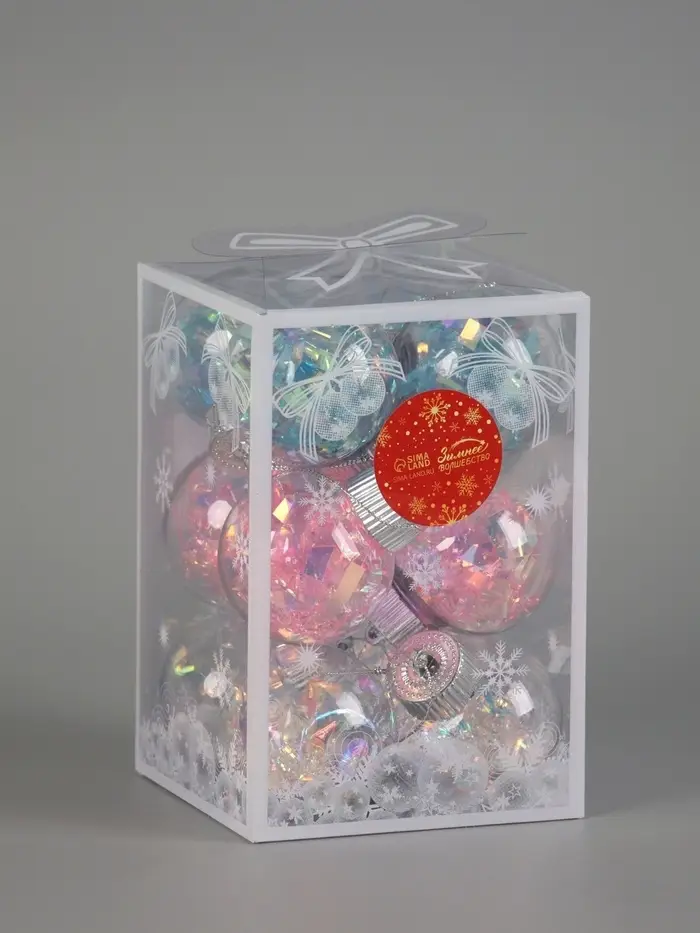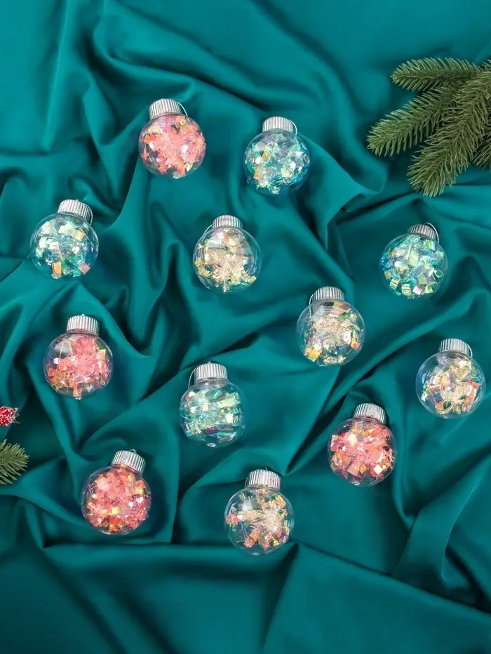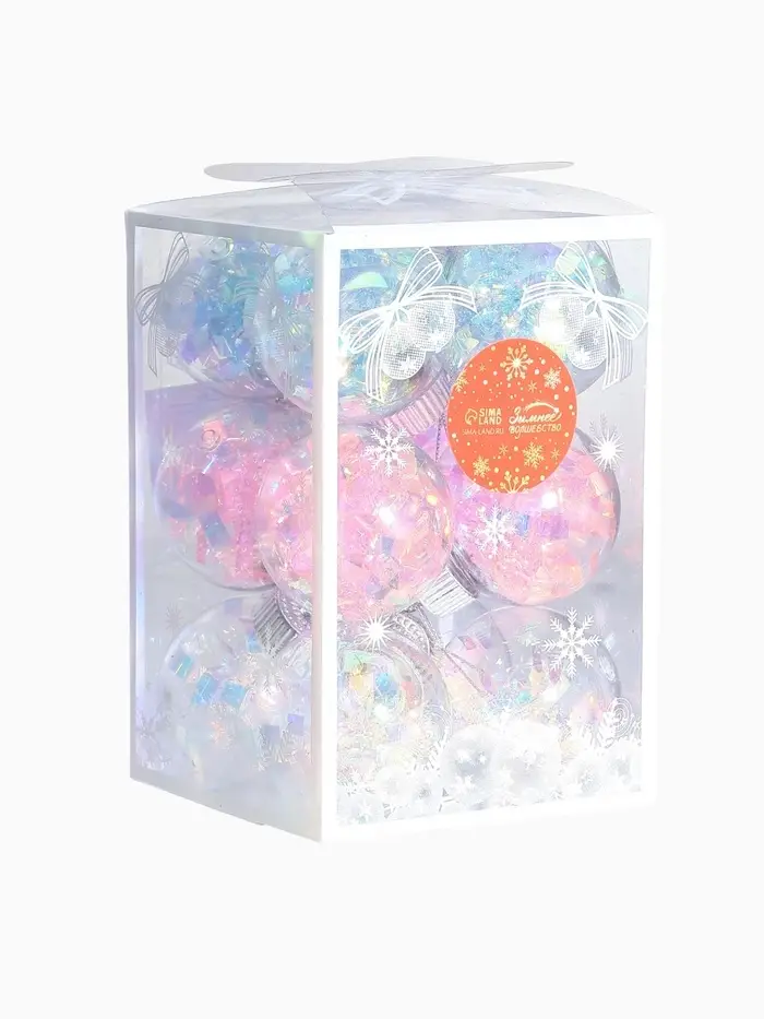 - Комплект из 12 шаров с прозрачной фактурой и мягкой цветовой палитрой.