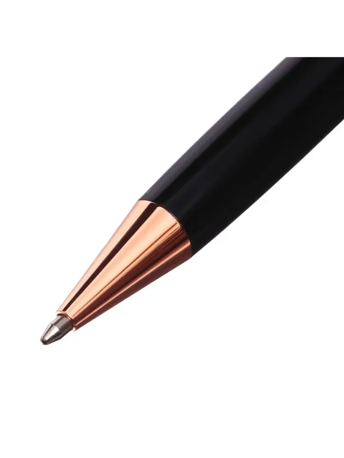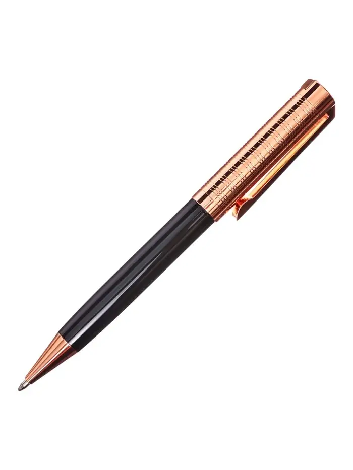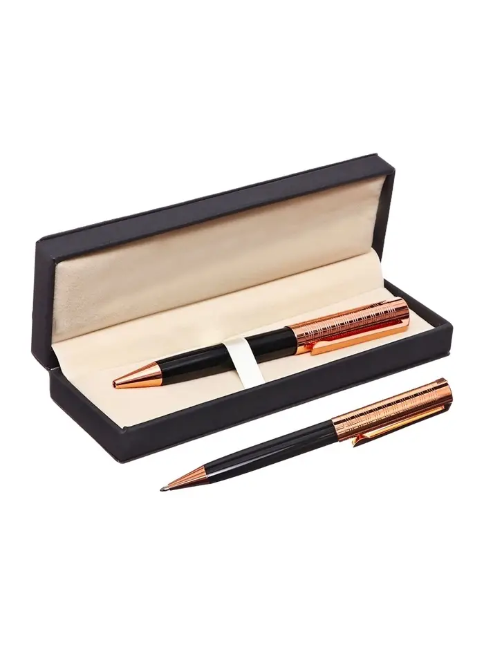Подарочная шариковая ручка в винтажном оформлении — сдержанный и продуманный вариант. Контраст чёрного корпуса и тёплого медного оттенка создаёт ощущение основательности и спокойной элегантности, без лишнего блеска.
