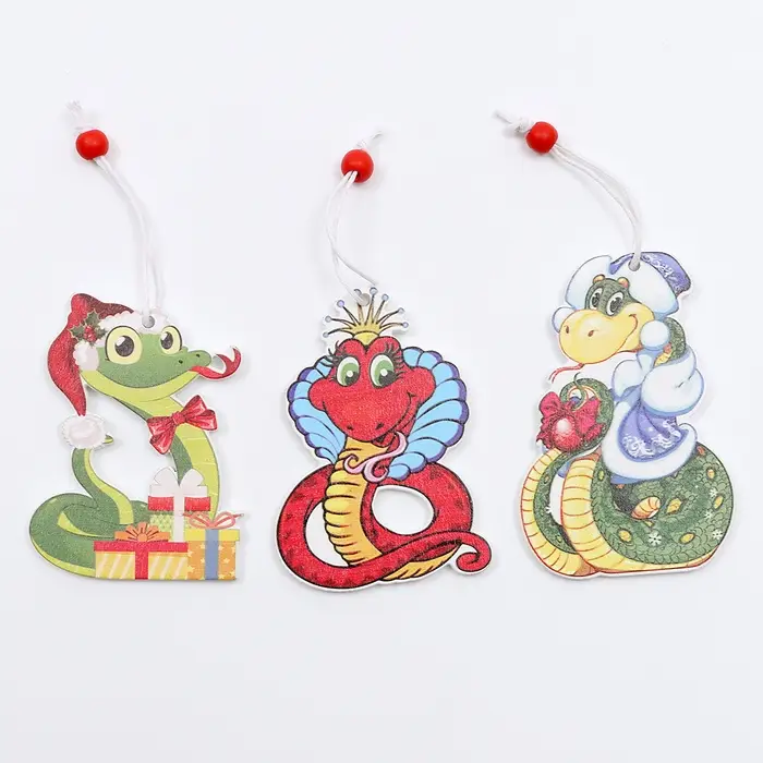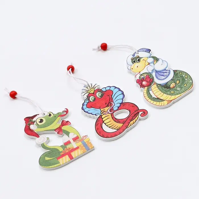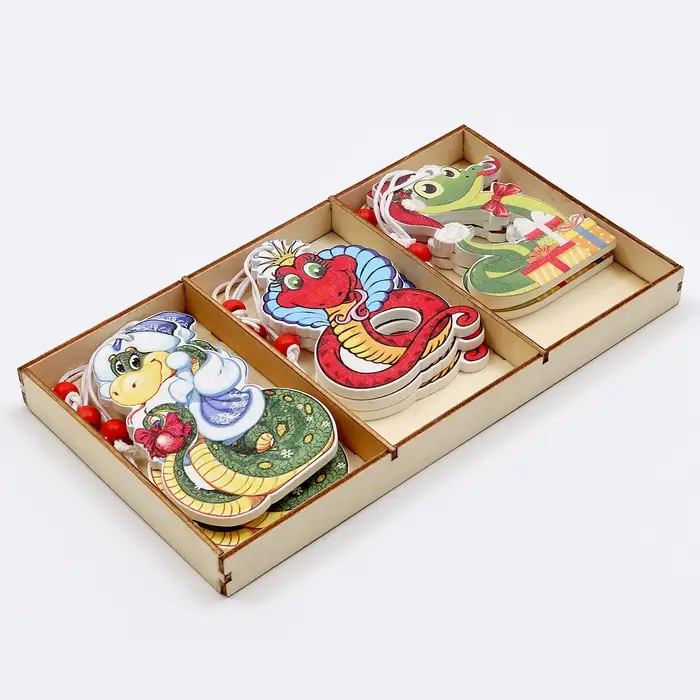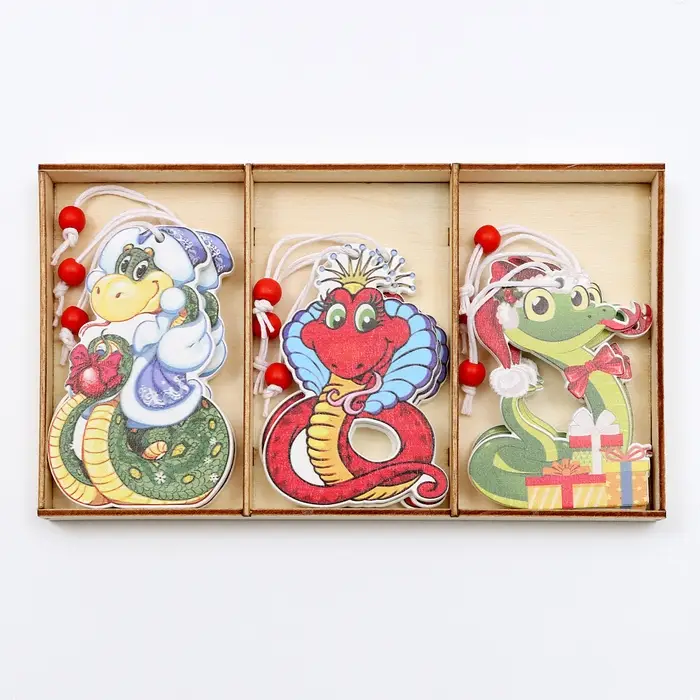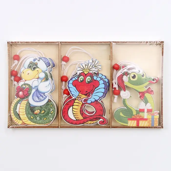 Набор из 9 деревянных подвесок — это идеальное решение для создания праздничной атмосферы. Фигурки в форме змей, символа 2025 года, станут ярким акцентом для украшения ёлки, сервировки стола или оформления интерьера. Каждый элемент набора выполнен из экологичных материалов — дерева и текстиля, что делает его долговечным и безопасным.