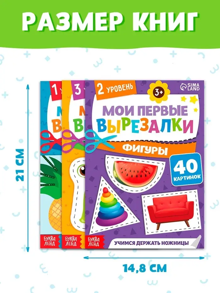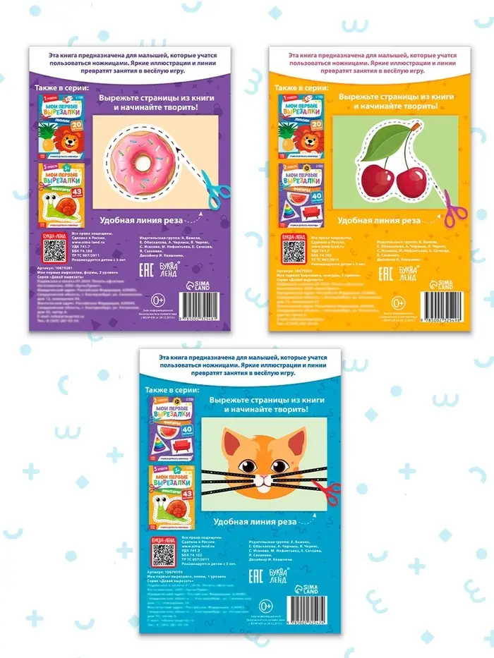 - Набор включает три книжки с заданиями для вырезания различных элементов.