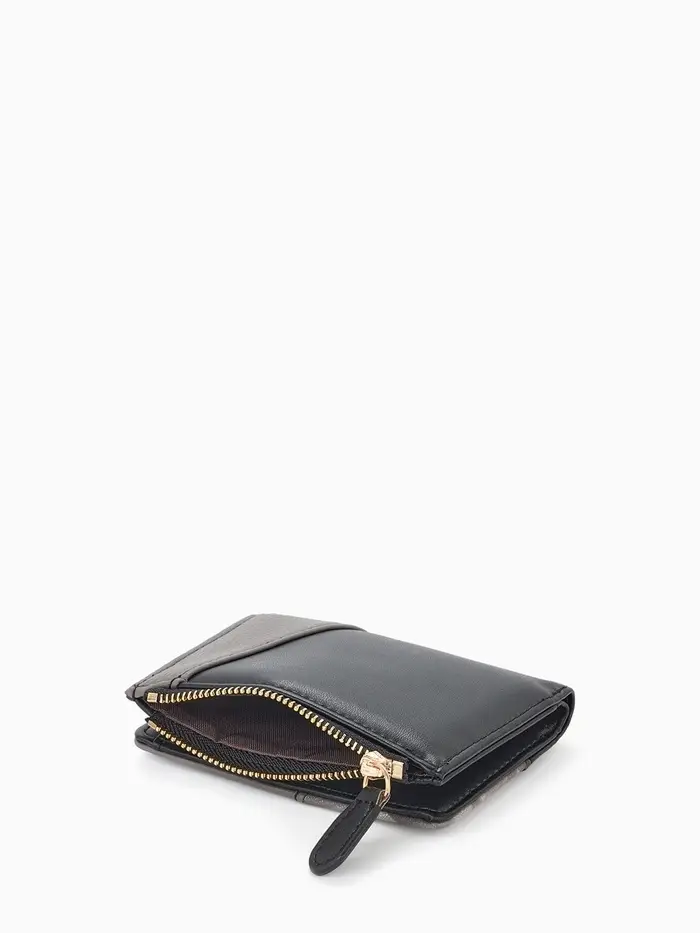 Чёрный компактный кошелёк с кнопкой предлагает сдержанную элегантность и практичную организацию пространства. Универсальный глубокий цвет легко интегрируется в любой стиль — от строгого офисного до повседневного городского. Продуманная конструкция сохраняет аккуратный вид даже при полном заполнении.