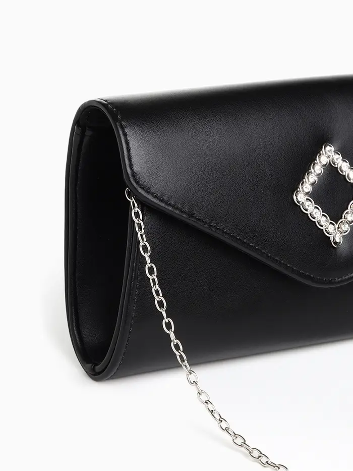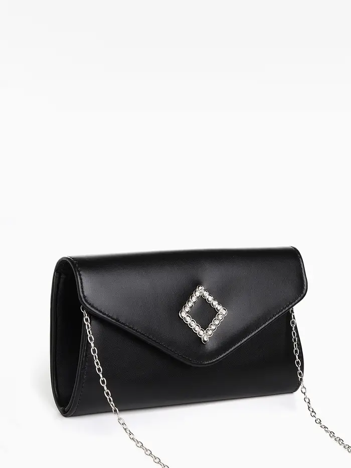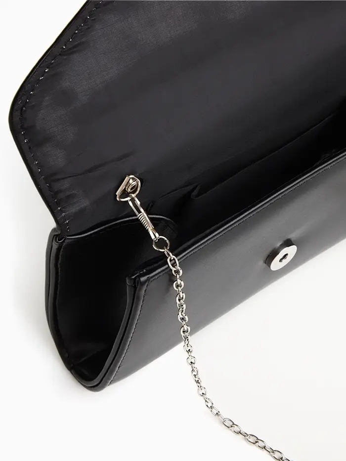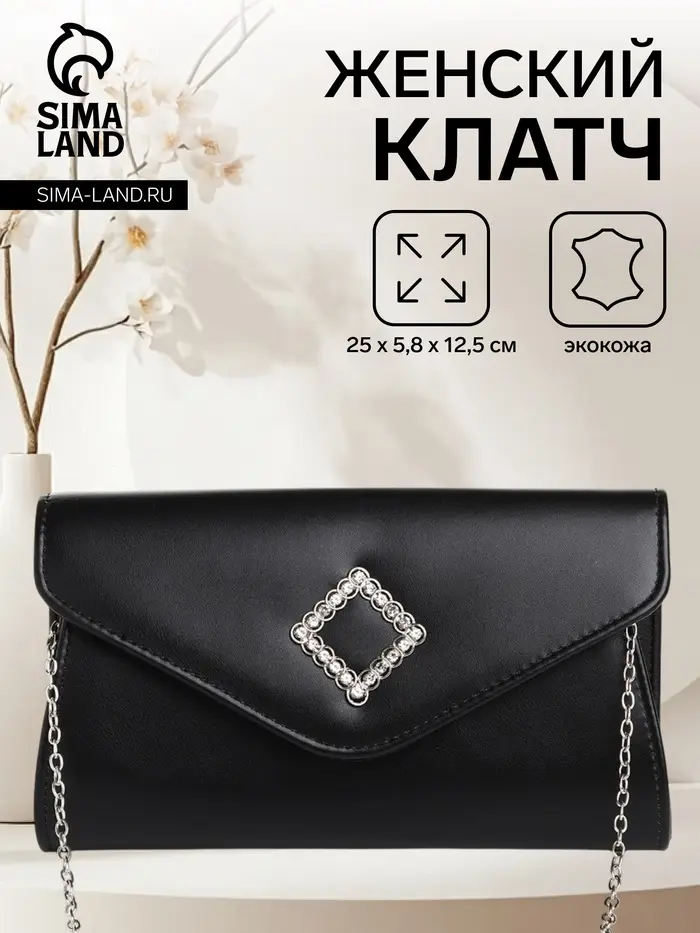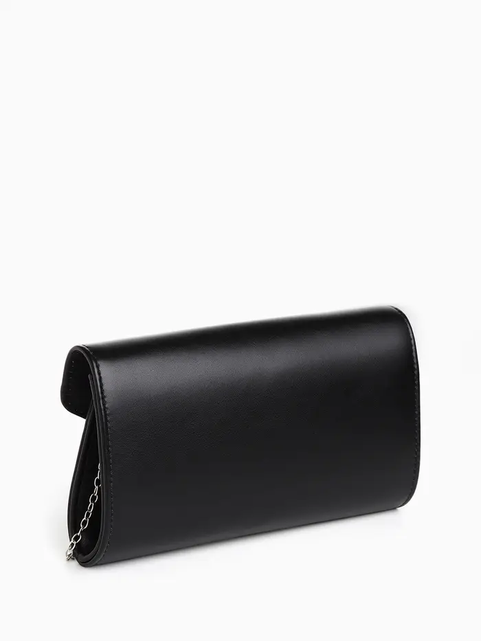 Сумка-клатч женская вечерняя на магните, на длинной цепочке, с декоративным элементом, однотонная, чёрная