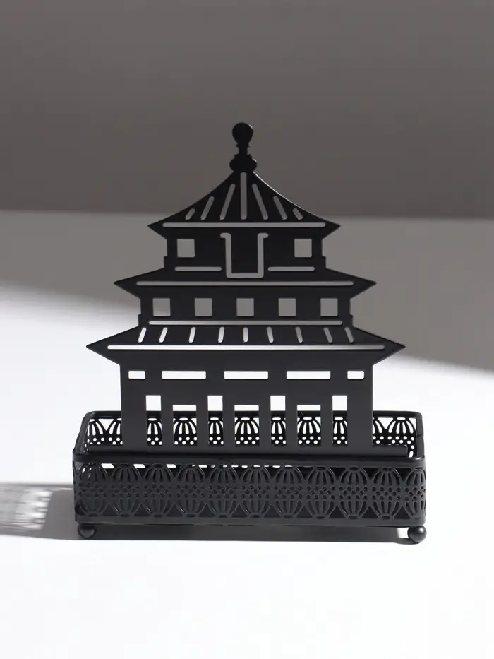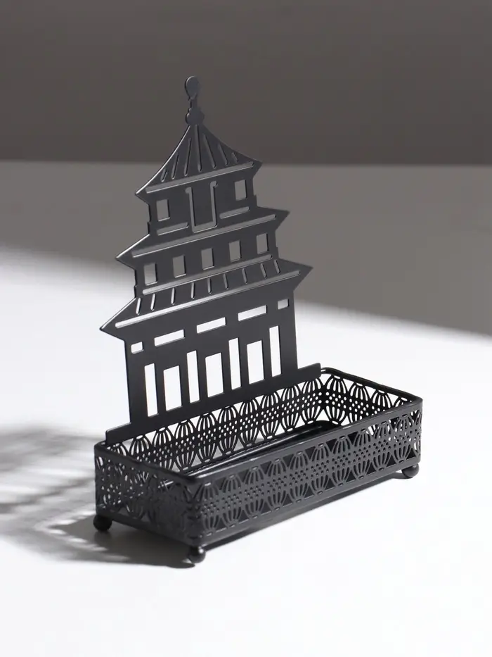 Эта чёрная металлическая подставка для мелочей в форме дворца — стильный и функциональный акцент для вашего стола. Её архитектурный силуэт напоминает о старинных европейских замках, привнося в интерьер ноту путешествий и истории. Прочное покрытие и устойчивое основание делают её не просто украшением, а практичным помощником для порядка.