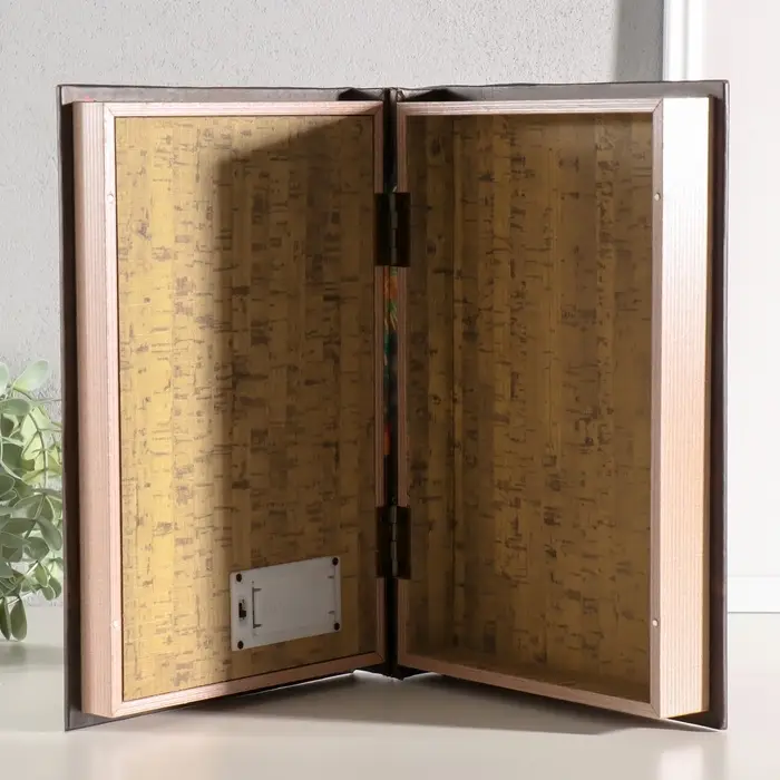 - Формат шкатулки-книги из дерева с покрытием под кожу для маскировки среди книг.