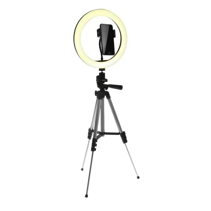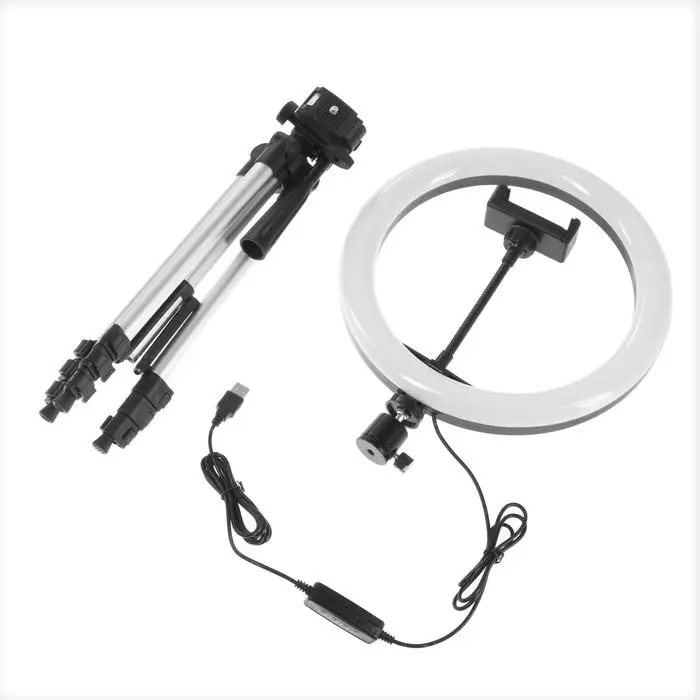Светодиодная кольцевая лампа на штативе от Luazon поможет создать равномерное освещение для съёмок фото и видео. Штатив позволяет зафиксировать смартфон и регулировать его угол наклона. Для работы подключите устройство к адаптеру питания или к USB-розетке. Меняйте режимы и изменяйте яркость с помощью пульта на проводе.