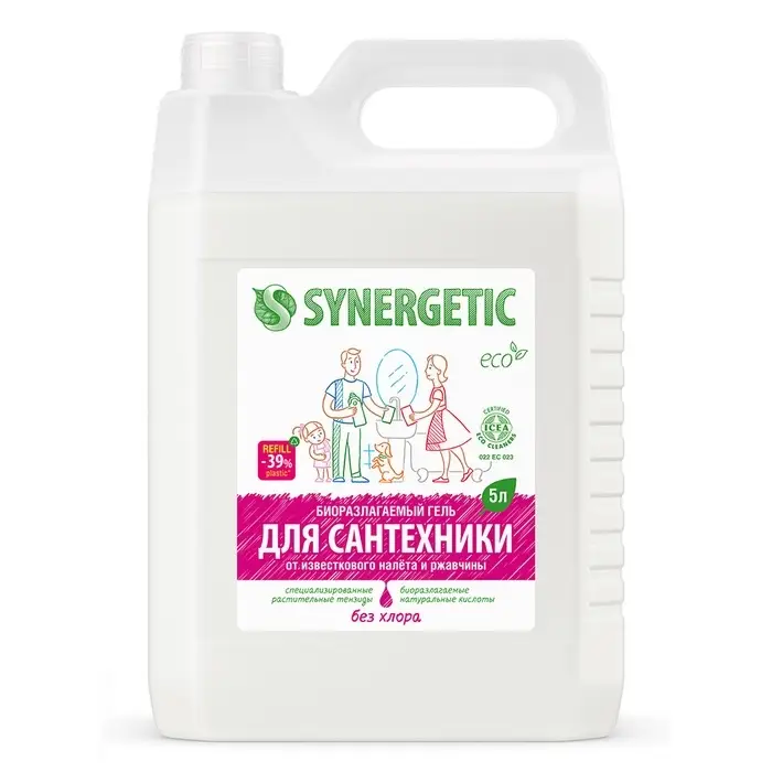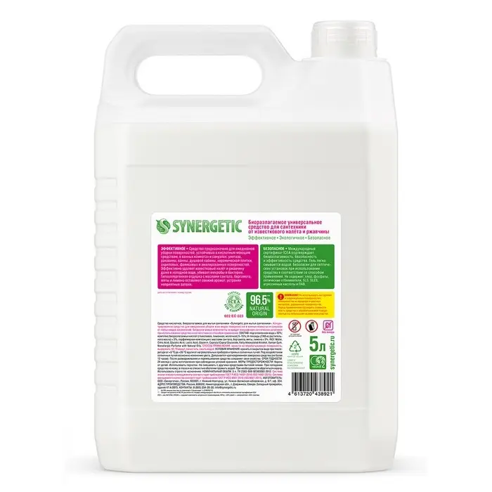 Биоразлагаемое универсальное средство для сантехники SYNERGETIC - концентрированное чистящее средство для ежедневной уборки поверхностей, устойчивых к кислотным моющим средствам, в ванных комнатах и санузлах: унитаза, раковины, ванны, душевой кабины, керамической плитки, акриловых, фаянсовых и эмалированных поверхностей.
