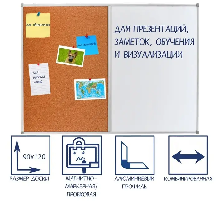 Комбинированная доска серии СТАНДАРТ - магнитно-маркерная и пробковая доски на единой рабочей поверхности - позволит разместить объявления при помощи кнопок и офисных булавок. Широко используется в организациях различного рода деятельности.