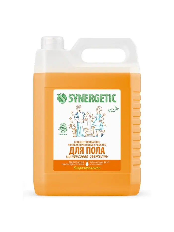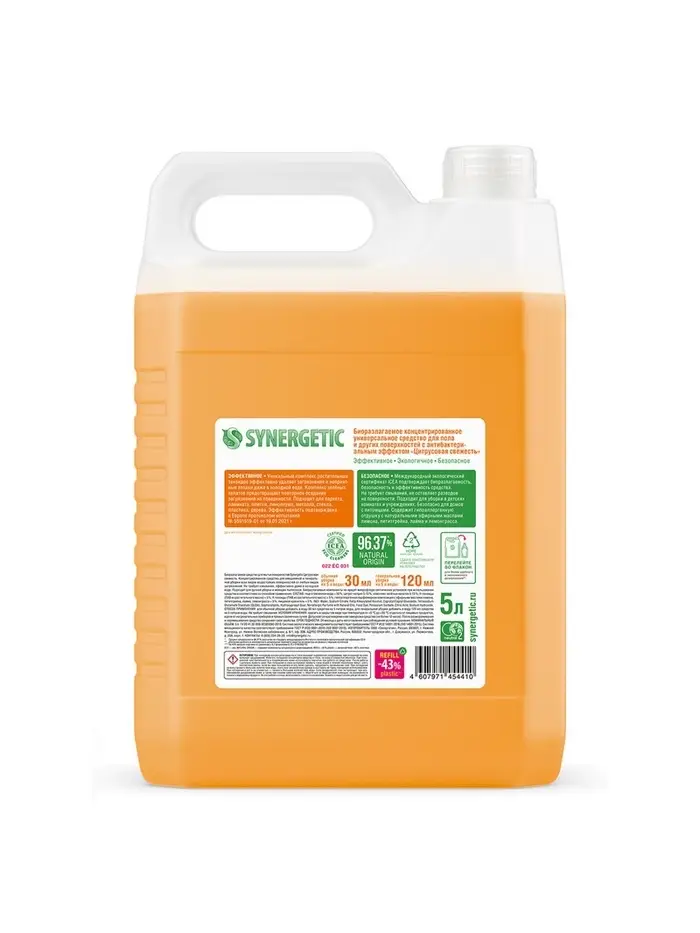 Биоразлагаемое концентрированное средство с антибактериальным эффектом SYNERGETIC "Цитрусовая свежесть" - универсальное средство для ежедневной и генеральной уборки пола и других поверхностей: столов, стен, потолка.