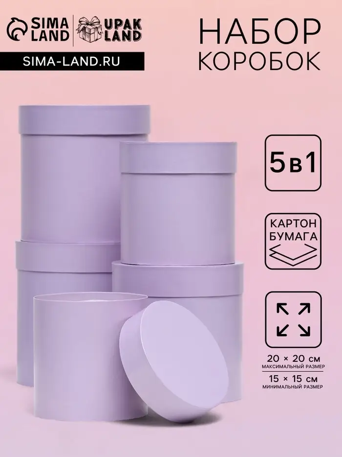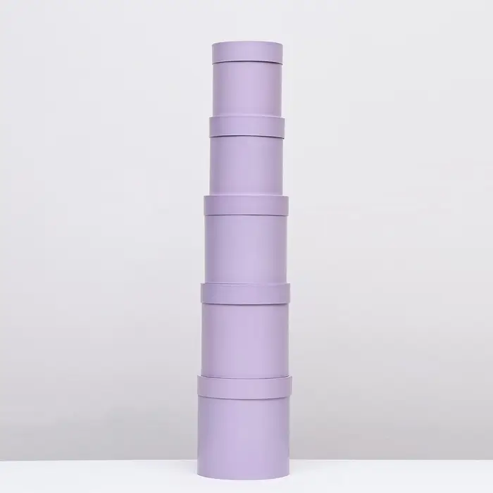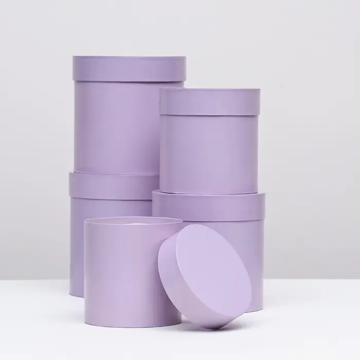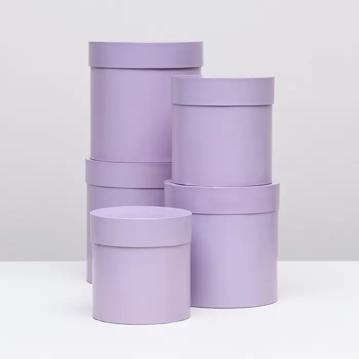 Перламутровый блеск в классической форме. Набор круглых коробок-тубусов 5 в 1 «Сирень перламутровая» — это комплект жёстких фигурных коробок с деликатным переливом. Пять вложенных друг в друга цилиндров из плотного картона предлагают решение для упаковки, где важны и безупречная форма, и лёгкий декоративный эффект.