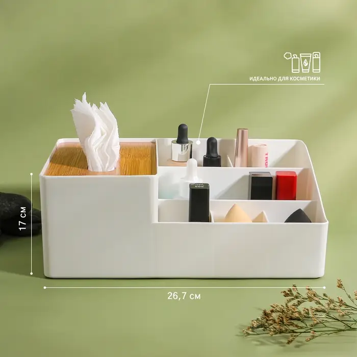 Органайзер подойдёт для всех необходимых средств для макияжа и ухода, а также для спонжей, щёток и других косметических принадлежностей. Изделие помогает поддерживать порядок, организовывать рабочее пространство и хранить всё необходимое в одном месте.