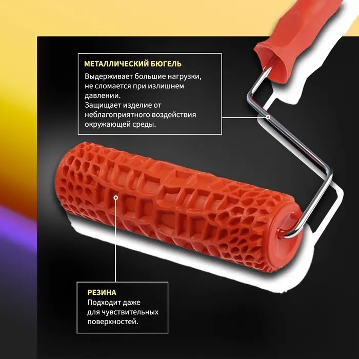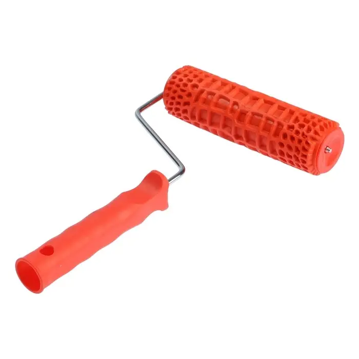 Как использовать: Наносите на предварительно подготовленную поверхность структурные составы, затем прокатывайте валиком для создания рельефа. Подходит для декоративной штукатурки, фактурных красок, жидких обоев. После работы сразу очищайте резиновую поверхность от остатков материала.