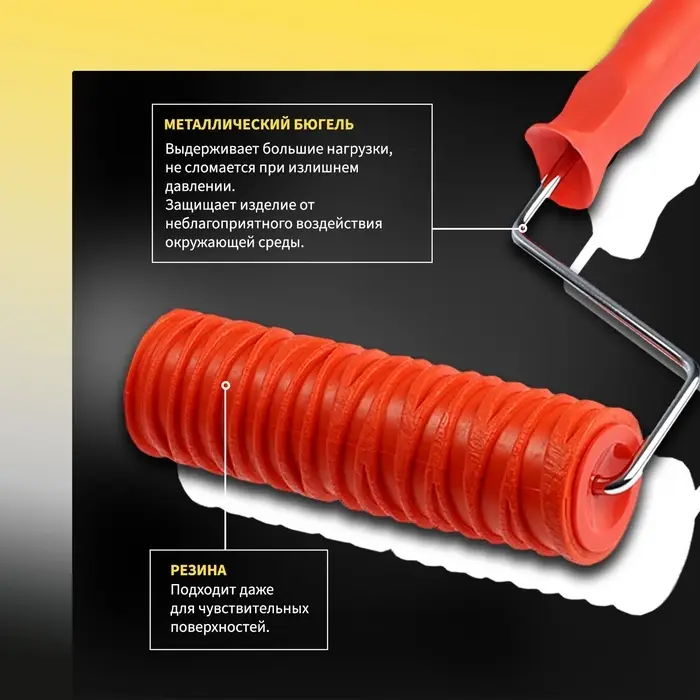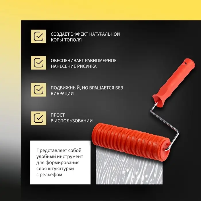 Декоративный валик помогает создавать разнообразные текстуры на поверхностях. Резиновая шубка и удобная рукоятка делают процесс нанесения краски или штукатурки простым и приятным.