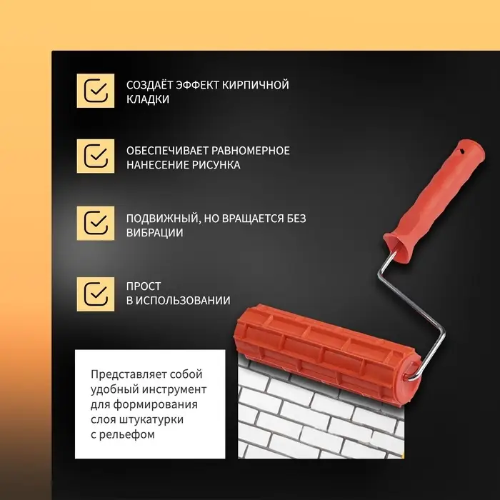 Создайте эффект кирпичной стены за несколько движений! Резиновый валик «Кирпичи» 180 мм — специальный инструмент для декоративной отделки. Формирует реалистичный рисунок кирпичной кладки на штукатурках и структурных красках.