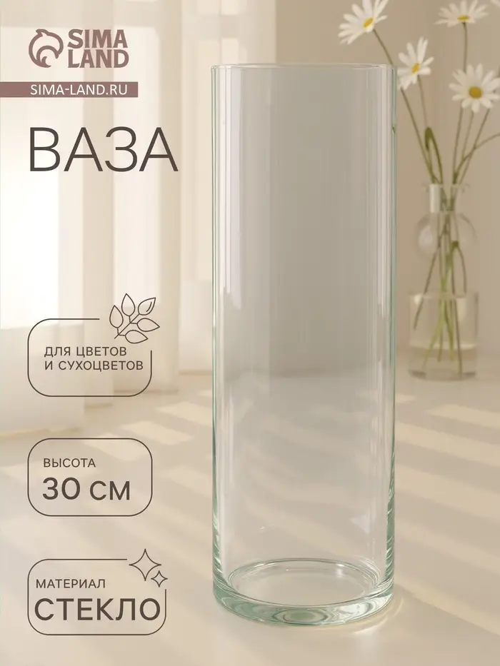 Воплотите в жизнь самые смелые дизайнерские идеи по украшению дома! Ваза из прозрачного стекла — основа для вашего творчества. Насыпьте в неё цветной песок, камушки, ракушки или другой декор. Создавайте восхитительные интерьерные композиции из цветов и зелени.