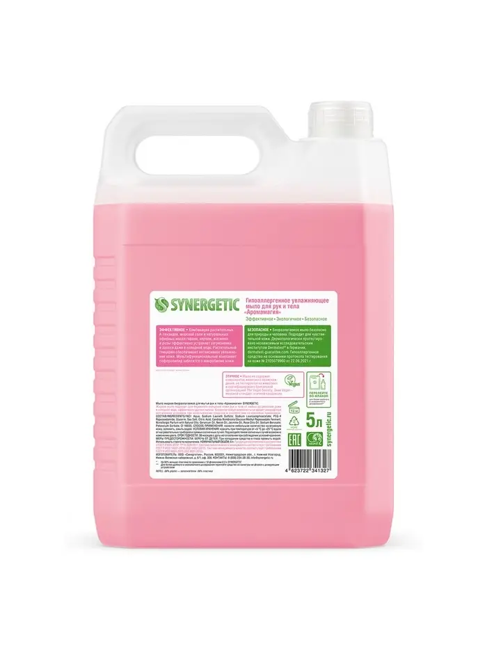 Биоразлагаемое увлажняющее мыло SYNERGETIC "Аромамагия" подходит для бережного очищения кожи рук и тела от любых загрязнений. Комбинация растительных А-тензидов, морской соли и натуральных эфирных масел герани, нероли, жасмина и розы эффективно устраняет загрязнения и неприятные запахи даже в холодной воде. Растительный глицерин обеспечивает интенсивное увлажнение кожи. Мультифункциональный компонент софоролипид мягко очищает и заботится о естественном микробиоме кожи. Гипоаллергенное средство подходит для чувствительной кожи. Мыло дерматологически протестировано независимым исследовательским институтом Dermatest®️ в Германии. Биоразлагаемые компоненты безопасны для природы и человека и не вредят микрофлоре септических установок. Жидкое мыло не содержит компонентов животного происхождения, не тестируется на животных и сертифицировано британской организацией The Vegan Society. Знак Vegan - мировой стандарт этичной продукции. Нанести небольшое количество на влажную кожу, вспенить, смыть водой. Только для наружного применения! Беречь от детей. При попадании средства в глаза промыть водой. Использовать строго по назначению. Aqua, Sodium Laureth Sulfate, Sodium Lauroamphoacetate, PEG-4 Rapeseedamide, Glycerin, Sea Salt, Undecylenamidopropyltrimonium Methosulfate, 2-Phenoxyethanol, Nonallergenic Parfume with Natural Oils, Candida Bombicola/Glucose/Methyl Rapeseedate Ferment, Citric Acid, Melaleuca Alternafolia (Tea Tree) Leaf Oil, Eucalyptus Globulus Leaf Oil, Thymus Vulgaris (Thyme) Flower/Leaf Oil, Spearmint Essential Oil, Lemongrass Essential Oil, Vitamin Complex (A, E, F): Ethyl Linoleate, Isopropyl Myristate, Cetearyl Ethylhexanoate, Triticum Vulgare Germ Oil, Retinyl Palmitate, Retinyl Acetate, Tocopheryl Acetate, Food Dyes (Tartrazine, Brilliant Blue).