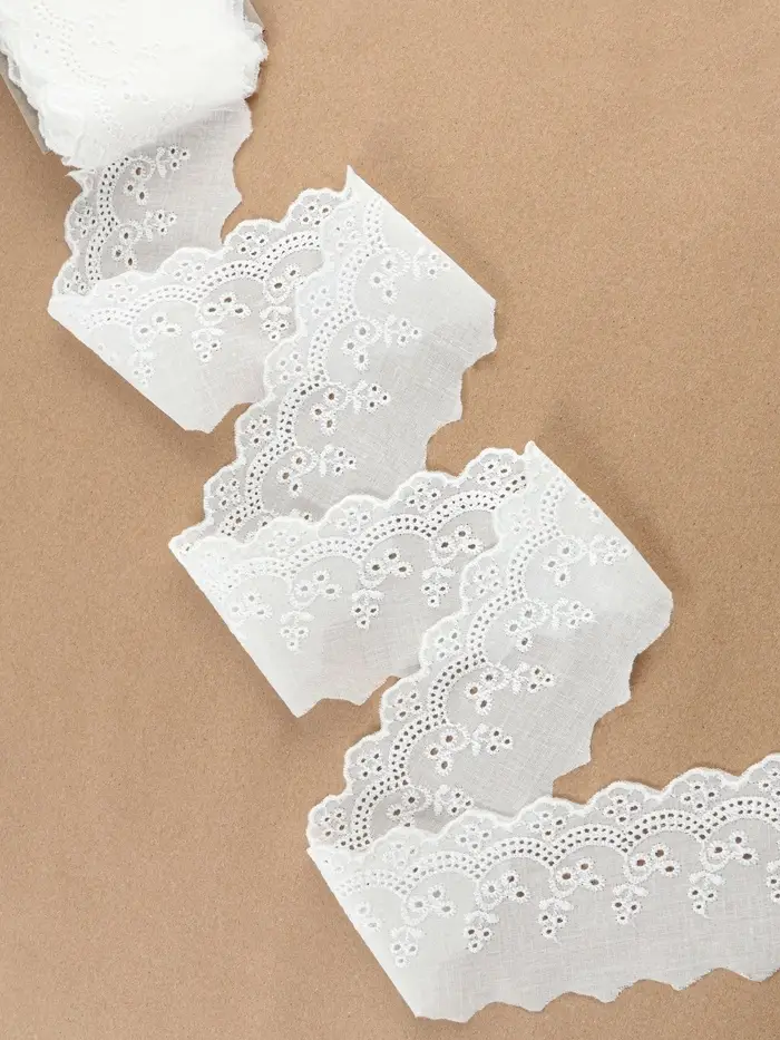 Белое кружево отлично подходит для пошива платьев, украшения скатертей и добавления праздничных акцентов в домашнем декоре. Длина позволяет применить его в различных проектах, от свадебного интерьера до уникальных аксессуаров. Добавьте роскоши в каждый момент вашей жизни с элегантным и многогранным кружевом из шитья.