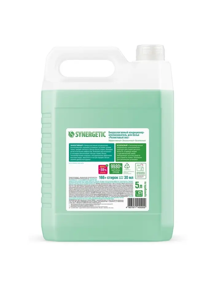 Биоразлагаемый кондиционер-ополаскиватель для белья SYNERGETIC "Реликтовый лес" – высокоэффективное средство, бережно ухаживающее за всеми типами ткани, в том числе деликатными, и придающее особую мягкость и нежность белью после стирки.