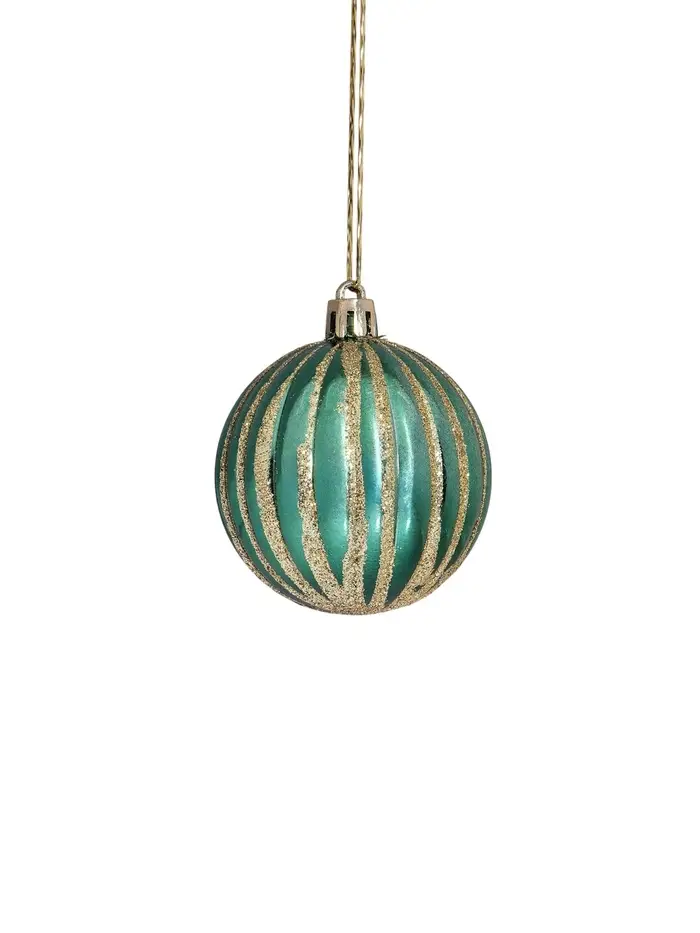 Новогодние шары с полосками и блеском — это праздничный декор в стиле новогоднего барокко. Набор из 12 пластиковых игрушек диаметром 6 см оформлен в зелёно-золотистой гамме с рисунком в виде аккуратных полос. Такие игрушки добавляют ёлке роскоши и создают ощущение зимнего торжества.