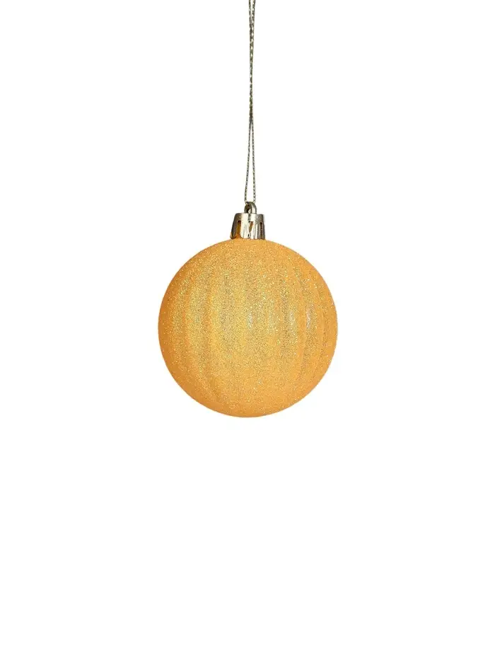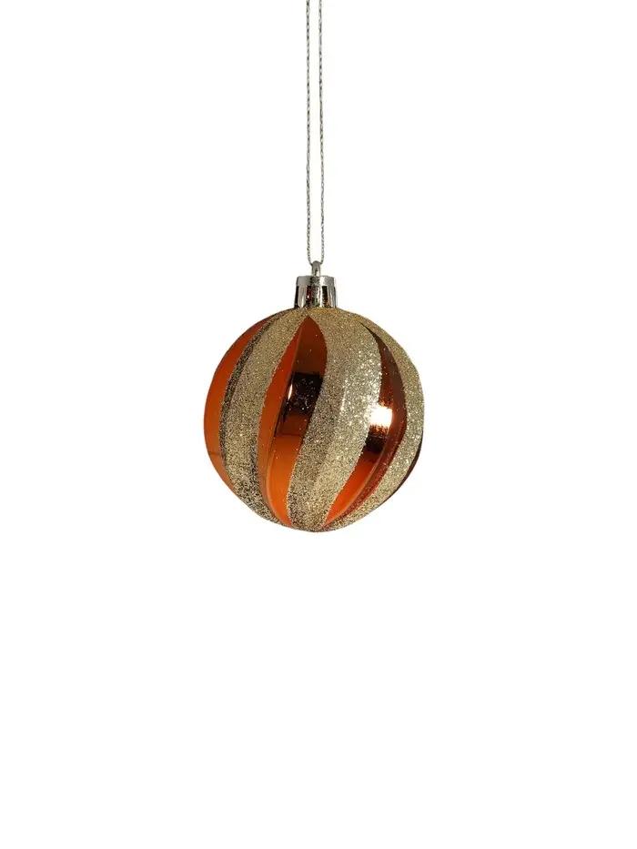 Создайте роскошный образ новогодней ёлки. Набор из 12 шаров диаметром 6 см с золотисто-оранжевыми полосами выполнен в стиле новогоднего барокко. Пластиковые украшения придают празднику изысканность и глубину цвета.