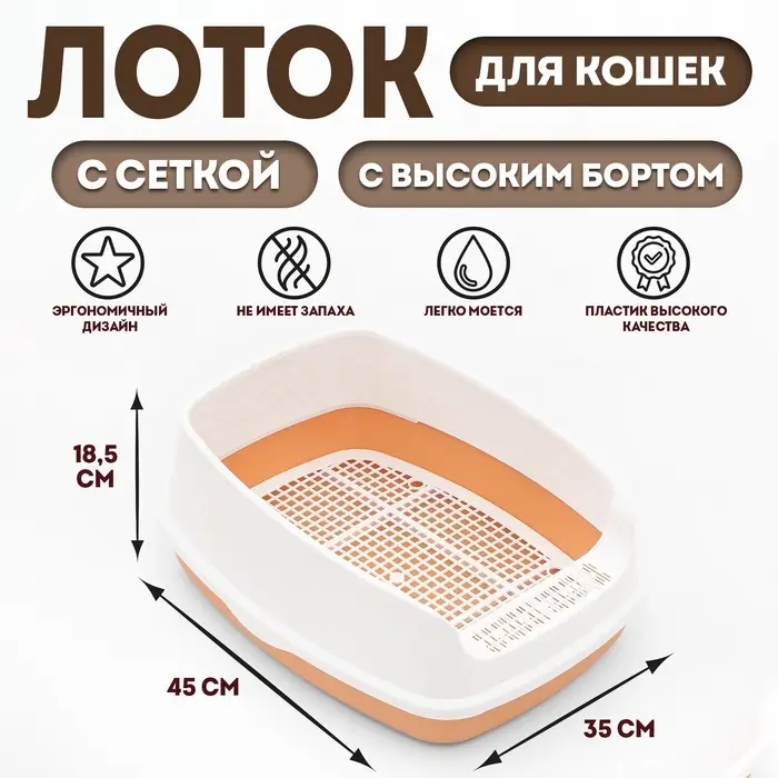 Туалет для кошек «Айша» S, 45×35×18.5 с, с высоким бортом и сеткой, пластик, оранжевый
